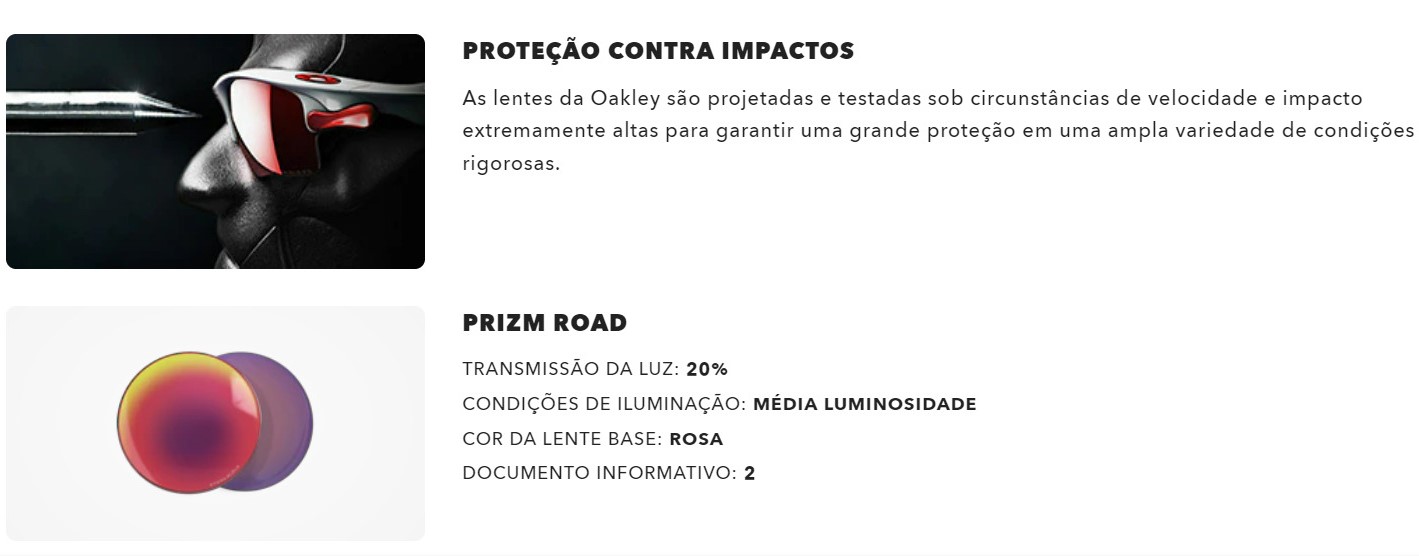 TECNOLOGIA ADVANCER CONTRA EMBAÇAMENTO: A tecnologia Oakley Advancer™ foi concebida para abrir instantaneamente a passagem do fluxo de ar e combater embaçamento e superaquecimento; TECNOLOGIA DA LENTE PRIZM™: Disponíveis com lentes Prizm™, pensadas para melhorar as cores, o contraste e os detalhes, e dar o máximo em qualquer atividade; Silhueta dos Radar EV com lente mais larga, para cobertura incrementada; O material leve da armação O Matter™ proporciona durabilidade e conforto ao longo do dia; ALMOFADAS DE NARIZ E HASTES EM UNOBTAINIUM™: As almofadas de nariz e as hastes Unobtainium™ aumentam a aderência com a transpiração e ajudam a manter os óculos seguros em seu lugar, sem abrir mão do conforto.